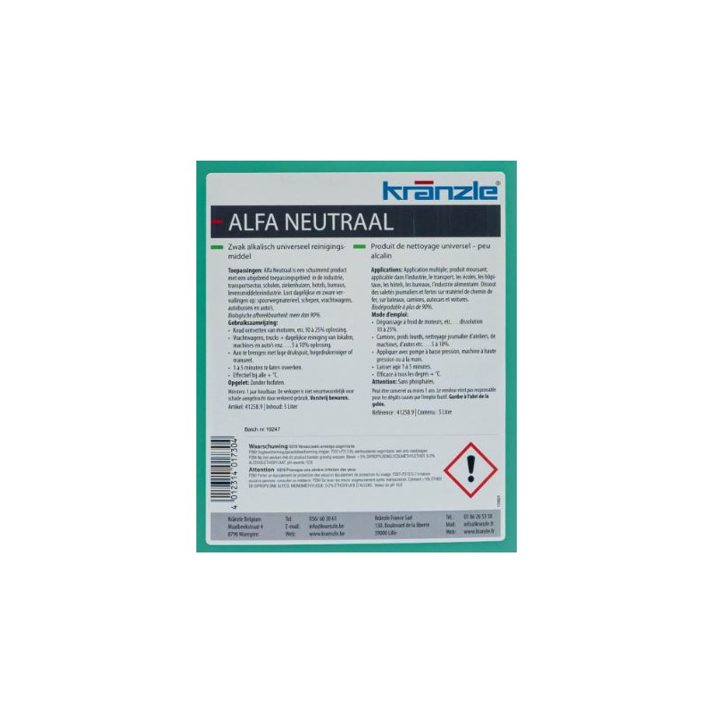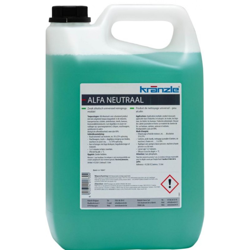 Le nettoyant universel Alfa Neutral de 5l conçu pour l'élimination de salissures tenaces avec un pH à 10,9. Ce nettoyant permet d'enlever les saletés qui adhèrent sur les engins de construction, le machinisme agricole, dans les locaux industriels et ceux assortis d'impératifs d'hygiène, dans l'hôtellerie, la restauration et l'industrie agro-alimentaire.